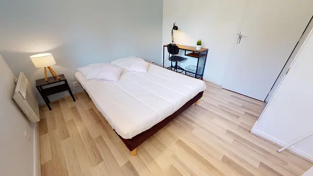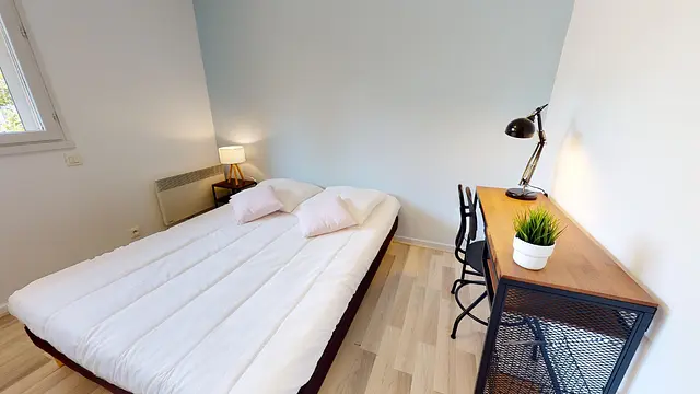 La chambre 4 de 11m2 adjacente à la salle de bain est entièrement équipée et aménagée : lit double, bureau, chaise et placard de rangement !