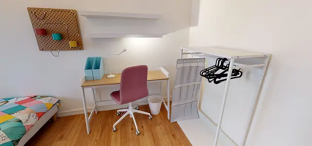 La chambre 4, donnant l’accès à un balcon, se compose d’un lit simple, d’un bureau et d’un portant à vêtements.