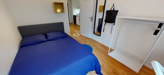 La chambre 2, très lumineuse offre tout le confort nécessaire avec un lit double, un bureau, un porte vêtement et un miroir.