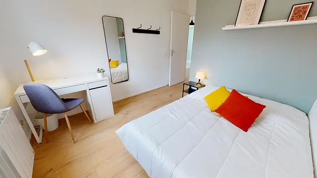 L’aménagement de la chambre 2 est complet. Elle se compose un lit double, un bureau, une chaise et des rangements.