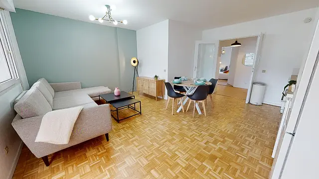 Le salon est aménagé avec un canapé d’angle, des tables basses et une table à manger idéale pour partager des repas entre colocataire.