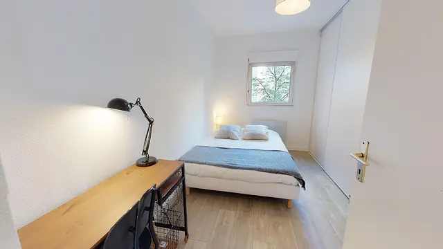 La chambre 1 dispose d’un lit double, d’une table de nuit avec lampe de chevet et d’un grand bureau. On trouve également un grand placard mural avec portes-coulissantes. La pièce est lumineuse.