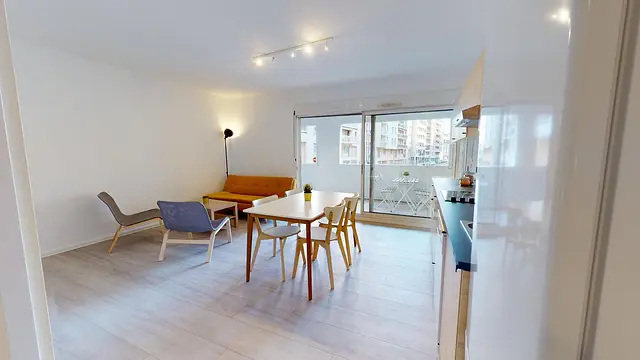 La cuisine ouvre sur le salon qui offre un vrai espace de vie pour la coloc avec grand canapé, table basse et fauteuils. Grâce à la b-vitrée, la pièce est très lumineuse. Gros coup de coeur pour le grand balcon qui permet de profiter des beaux jours.