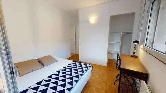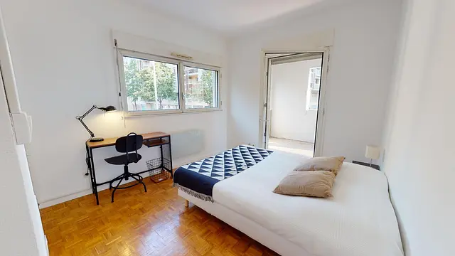 La chambre 4 bénéficie d'un accès au balcon. Elle est attenante au salon et propose le même ameublement: lit double, bureau, table de nuit et un petit dressing aménage subtilement dans la niche.