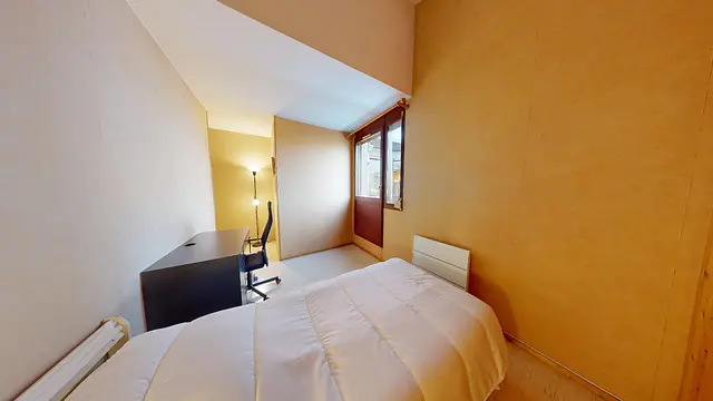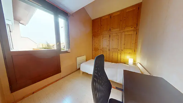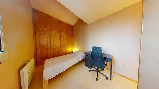 Cette chambre dispose d'un lit simple, d'un chevet, d'un bureau, d'une chaise, de nombreux placards muraux et d'un accès au balcon.