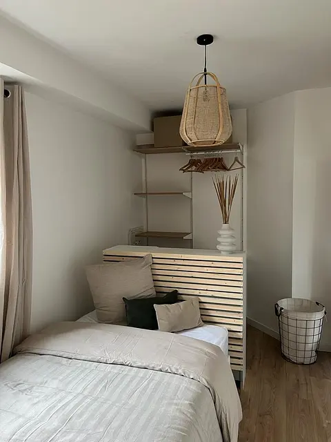 Cette chambre dispose d'un lit de 120 cm, un espace dressing ainsi qu'un bureau sur mesure avec une chaise et une lampe.