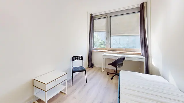 Cette chambre est équipée d'un lit simple, d'un chevet, d'une armoire, d'un bureau et de sa chaise.