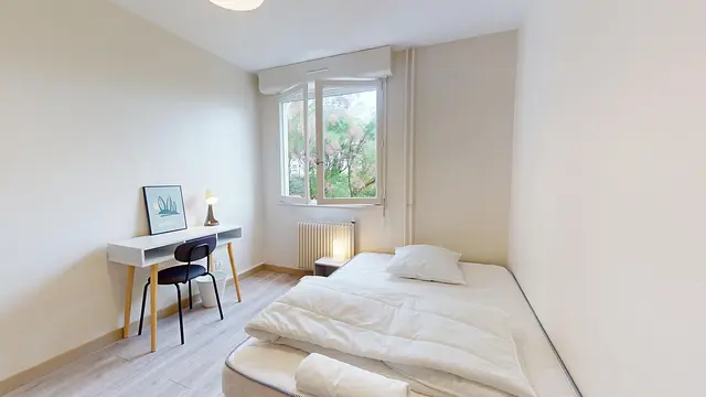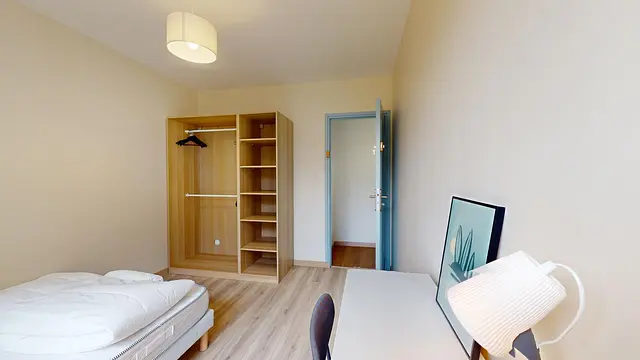 Cette chambre est lumineuse et dispose d'un lit double, d'une table de chevet, d'un bureau et d'un meuble de rangements