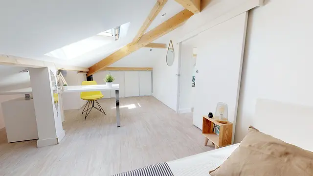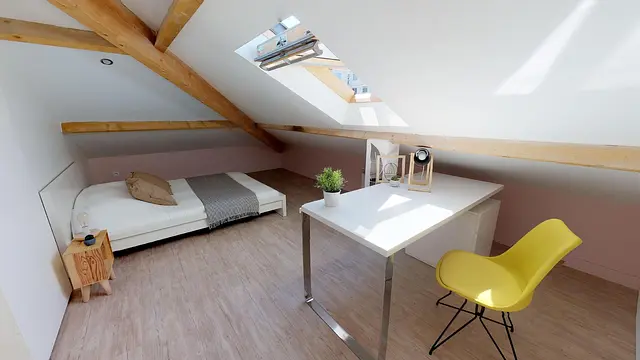 La chambre 4 se trouve au dernier étage de la maison, dans un coin nuit comprenant deux chambres et une salle de bain entièrement rénovée. Elle dispose d'un lit double, de nombreux placards de rangement et d'un grand bureau. Elle a le charme des pièces sous combles avec parquet, poutre apparentes et grand velux, qui lui apporte une belle lumière naturelle. Elle a une surface au sol de 24 m² !