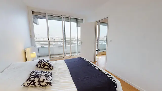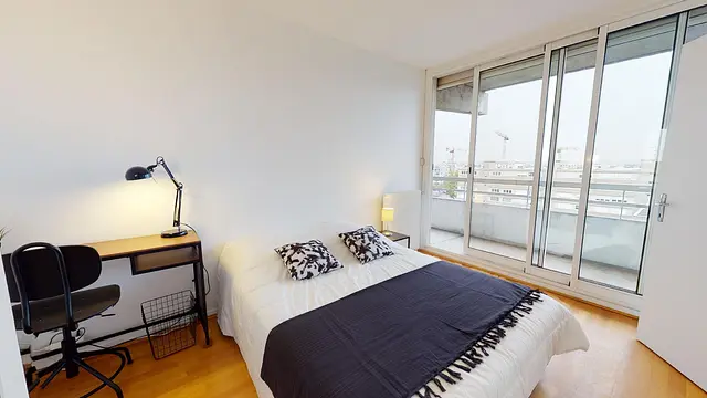 La chambre 4 dispose d’un accès au balcon. Grâce aux b-vitrées, elle dispose d’une super luminosité et d’une vus sans vis-à-vis. On retrouve du parquet au sol, un grand lit double, un bureau, table de nuit et lampe de chevet, ainsi qu’un grand placard avec porte miroir.