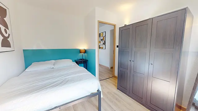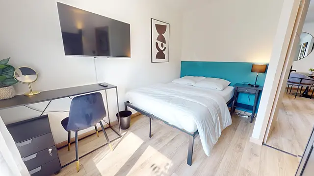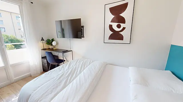 La chambre est équipée d'un lit double, bureau, rangements. Le plus : elle dispose d'une TV privative, dans l'agencement est optimisé grâce à la fixation murale. Elle donne aussi sur un balcon privatif.