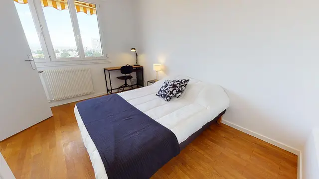 La chambre 2 de 11m2 offre tout le confort nécessaire de part son aménagement complet : lit double, bureau, penderie, etc.