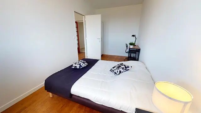 La chambre 1 de 12m2 , accessible par la salon, offre une vue dégagée et sans vis-à-vis et se compose d’un lit double, d’un bureau et une penderie.