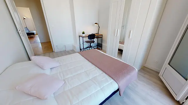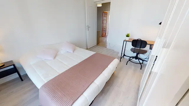 La grande chambre 4 de 12m2, située à proximité de l’entrée, est très lumineuse grâce à ses grandes fenêtres et à sa loggia privative de 4m2. La chambre se compose d’un lit double, d’un bureau, d’une chaise et d’une penderie.
