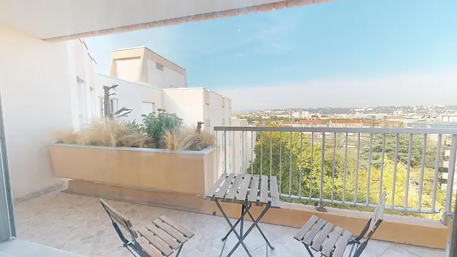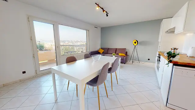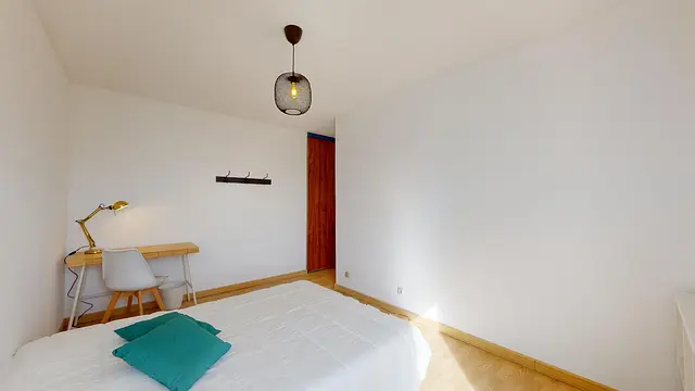 La colocation comporte une pièce de vie lumineuse avec un espace salle à manger et table pour tous les colocataires, et un coin salon avec canapé, et table basse. Le séjour donne accès à un balcon !
