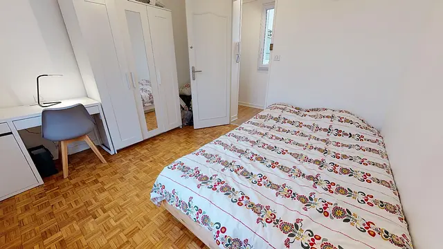 La chambre 4 située sur la droite de l’entrée est équipée avec un lit double, un bureau, une chaise et un placard de rangement.