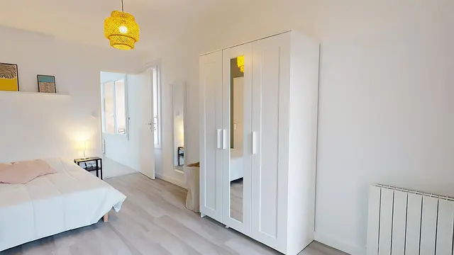 Cette belle chambre donne accès à un petit balcon privé. Elle est équipée avec bureau, placard, lit double, commode de chevet et lampe de chevet et de bureau.