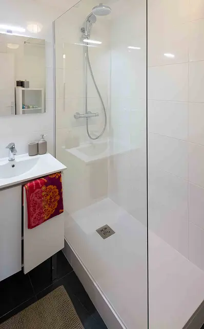 La salle de bain dispose d'une grande douche, d'un meuble vasque et d'un radiateur sèche-serviette.