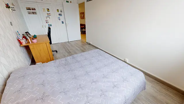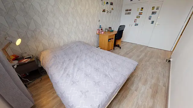 La chambre 2, très lumineuse grâce à sa double fenêtre offre tout le confort nécessaire avec un lit double, une table de chevet, un placard intégré et un bureau avec son fauteuil.