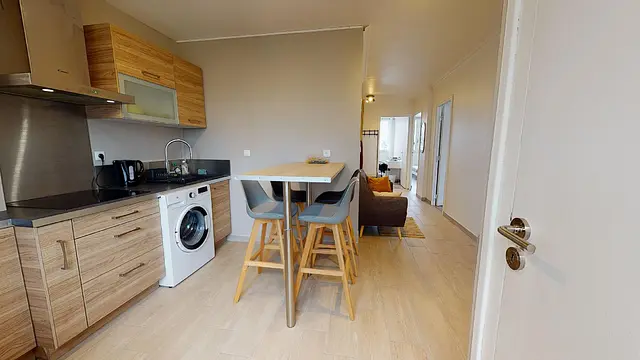 L’appartement se compose d’un canapé avec une table basse et d’une cuisine totalement équipée : une table haute avec des tabourets, un frigo, une bouilloire, une machine à café, des plaques de cuisson, une hotte, un four et un micro-onde.