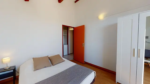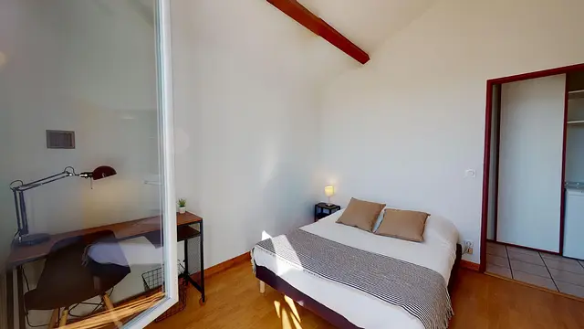 Située au deuxième et dernier étage de l’immeuble, la chambre 6 est un véritable cocon lumineux. Elle dispose d’un grand placard, d’un bureau et d’un lit double, offrant tout le confort nécessaire au quotidien.