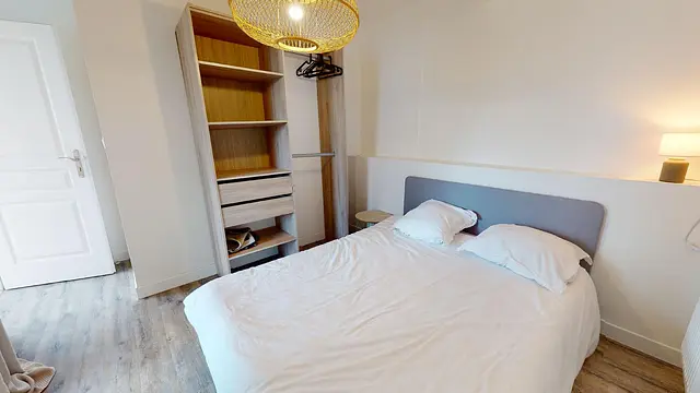 Cette chambre est équipée d'un lit double, bureau, et grand placard de rangement