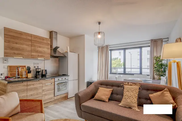 L'appartement possède une belle pièce de vie avec canapé, table basse, tapis, TV et meuble TV ainsi qu'un coin salle à manger avec table pour l'ensemble des colocataires. La cuisine est ouverte et équipée avec four, plaque de cuisson, hotte, frigo, ainsi que de nombreux rangements.