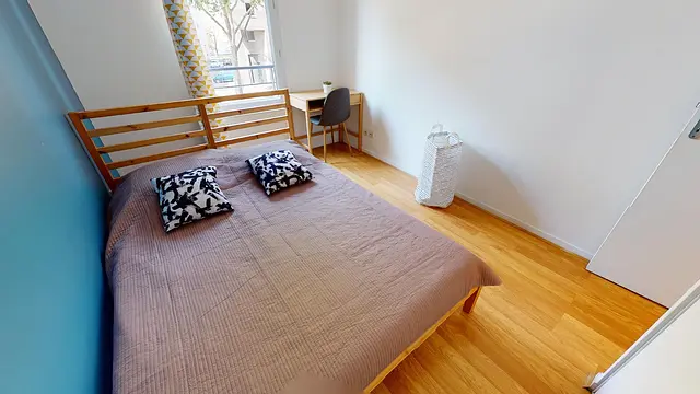 La chambre 1 de 10m2 avec son mur bleu se compose d’un lit double, d’un bureau, d’une chaise et d’un placard de rangement.