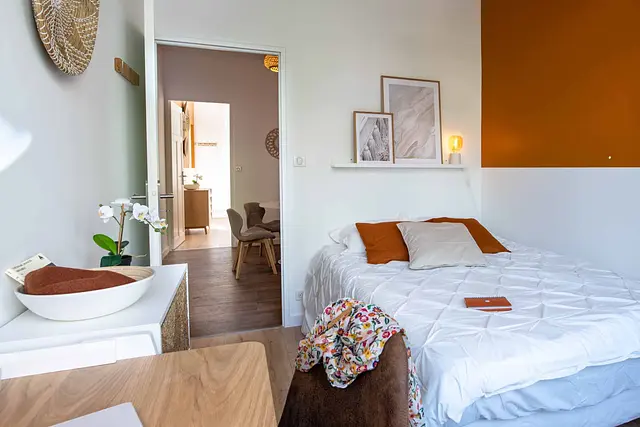 L'appartement est complètement équipé et meublés et a été rénové très récemment avec gout. La cuisine est équipée d'un lave-vaisselle, d'un four, de plaques de cuisson ainsi que de nombreux rangements. Chaque chambre dispose d'un lit double, d'un bureau accompagné d'une chaise et d'une lampe, ainsi que de rangements.