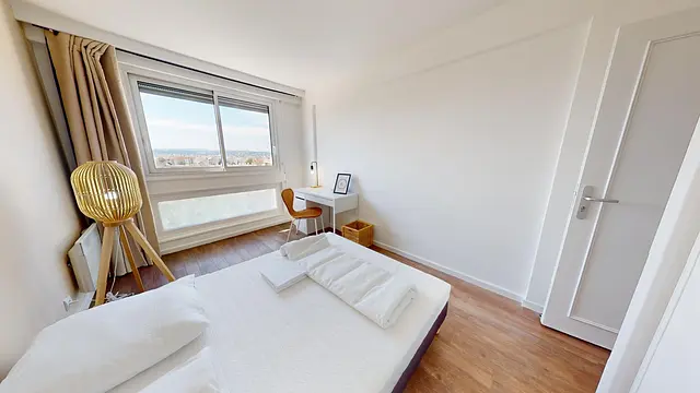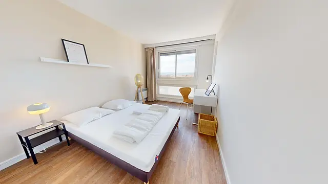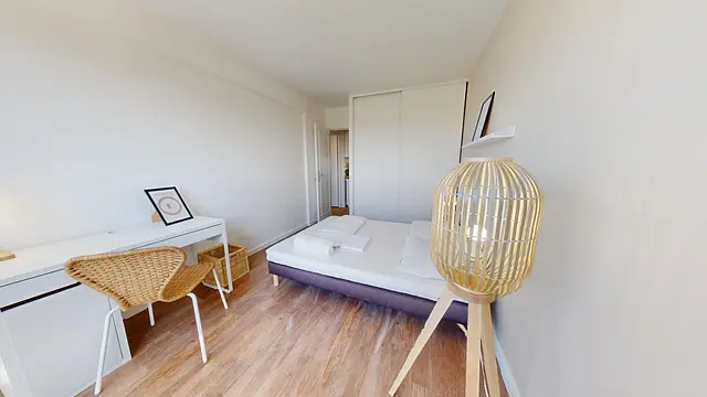 La chambre est équipée d'un lit double, d'un chevet, d'un placard encastré, d'un bureau et d'une chaise.