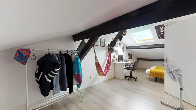 Le coin nuit se trouve à l'étage du duplex et au dernier étage de l'immeuble. La chambre 1 possède le charme des pièces sous les combles et une surface au sol de 28 m² (10 m² en loi Carrez). Elle est entièrement meublée et dispose d’un lit double, de nombreux rangements (commode et étagères) ainsi que d’un bureau et d’une chaise : tout le confort attendu pour emménager rapidement.