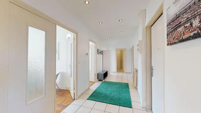L’entrée s’ouvre sur un grand couloir carrelé qui dessert les 5 chambres et les espaces communs. Les colocataires disposent notamment d’une buanderie attenante à la cuisine, équipée d’un séchoir et d’une machine à laver et d’un WC séparé. La salle de bains est équipée d’un grand meuble double vasque avec miroir et d’une cabine de douche, ainsi que de rangements.