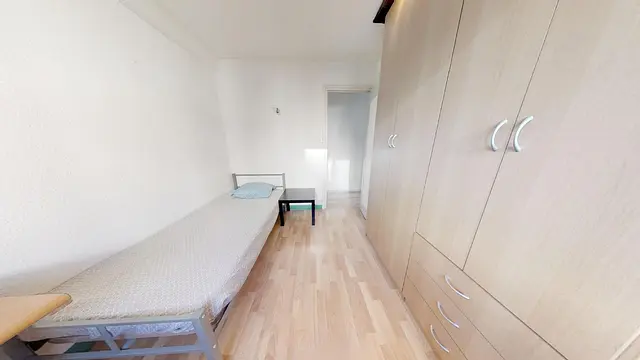 La chambre 3 dans le couloir à droite est très lumineuse est totalement aménagée et équipée : un lit simple, un bureau avec chaise et un placard.