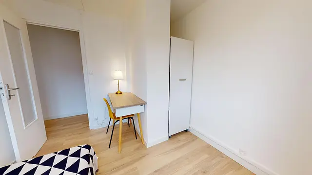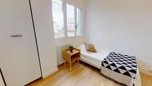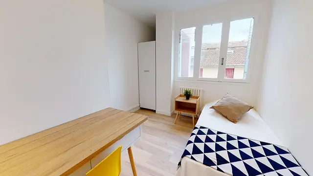 La chambre 2, claire et lumineuse, dispose d’un lit simple (avec couette et oreillers fournis), d’une table de nuit, d’un bureau avec une lampe stylée, de deux colonnes sur roulettes encastrables pour un maximum de place gagné. Elle donne sur une rue calme avec quelques maisons individuelles.