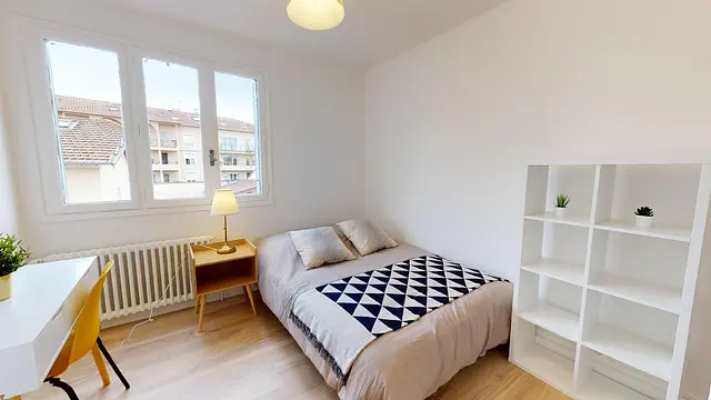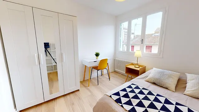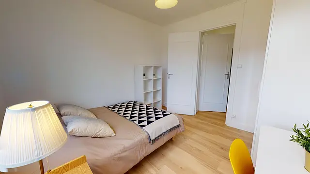 La 4ème chambre de cette colocation est très agréable à vivre : lumineuse grâce à son parquet flottant en bois clair et ses murs blancs, elle est sans réel vis à vis. Elle dispose d'un lit double (literie fournie) avec table de nuit et lampe de chevet, d'un grand placard, d'un meuble "cases", et d'un bureau. Idéal pour emménager confortablement.