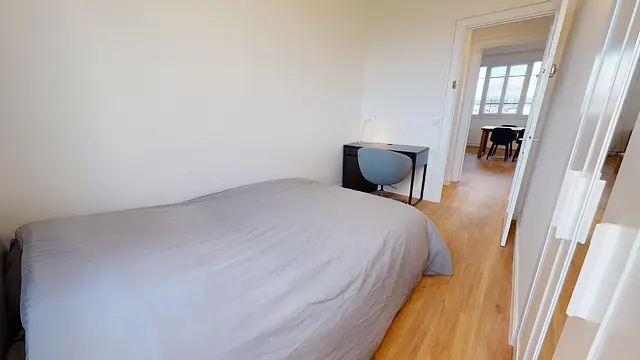 La chambre 4 de 10m2 est très lumineuse. Cette chambre est totalement équipée : lit double, bureau, chaise et placard de rangements.
