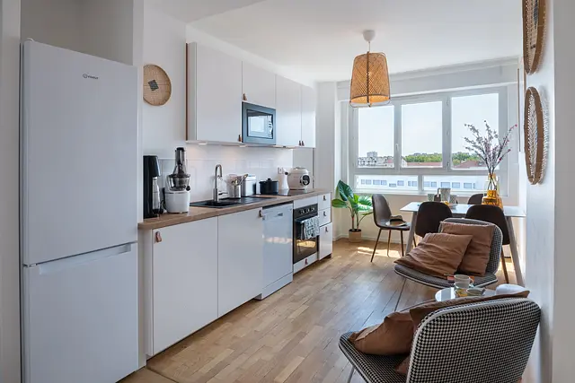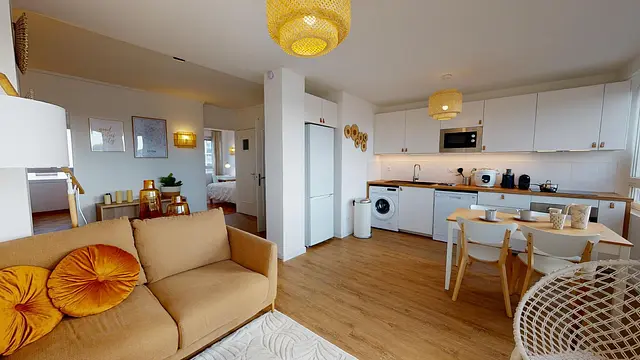 L'appartement a été rénové récemment de manière moderne. Il est entièrement meublé avec une cuisine tout équipé,plaque de cuisson, cookéo et un grand frigo, une salle de bain avec douche et lave-linge et un WC séparé. L’appartement très lumineux contient 4 chambres