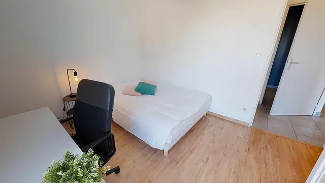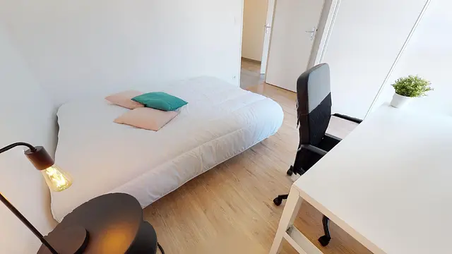 La chambre 3 lumineuse offre tout le confort nécessaire grâce à son lit double, son bureau, sa chaise et ses rangements.