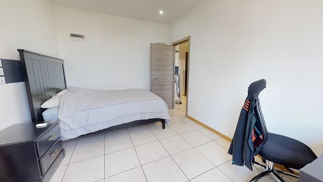 La chambre 4 au 1er étage offre tout le confort nécessaire : lit double, bureau, chaise et rangement.