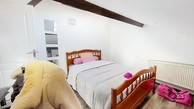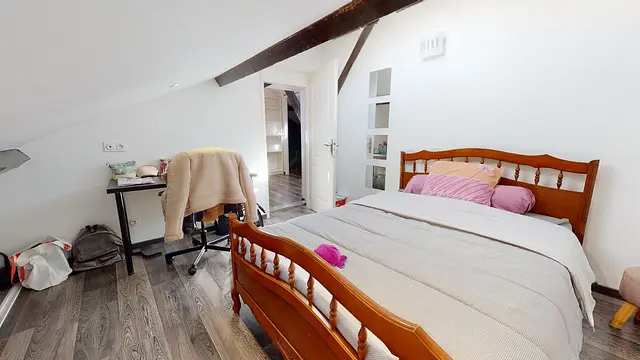 L'aménagement de la chambre 7 au dernier étage offre tout le confort nécessaire : lit double, bureau, chaise et rangements.