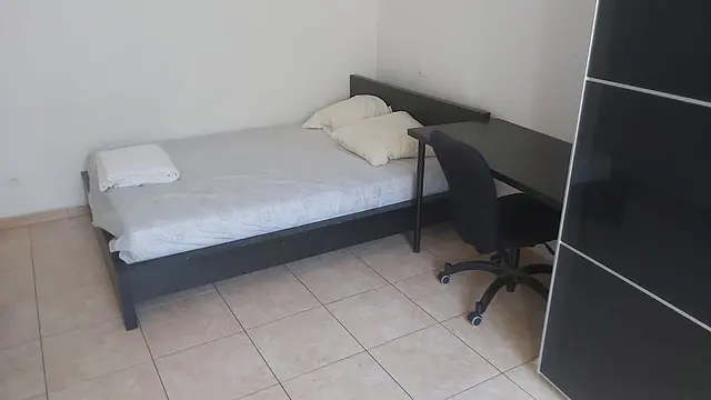 La chambre 5 lumineuse est aménagée avec un lit double, un bureau, une chaise et des rangements.