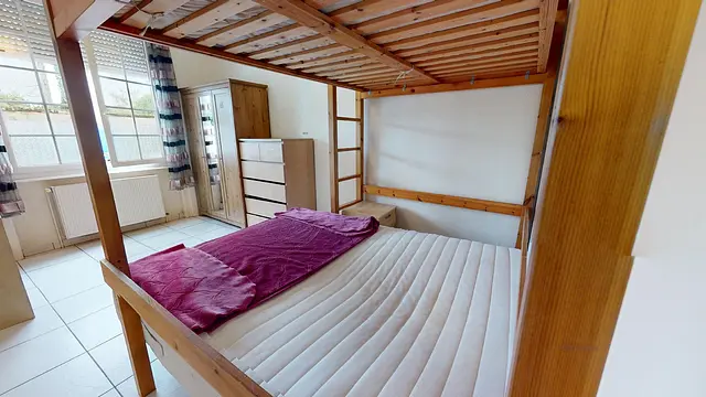 L'aménagement de la chambre 2 au RDC comporte un lit double ainsi qu'un espace mezzanine, un bureau, un placard et une commode de rangement.
