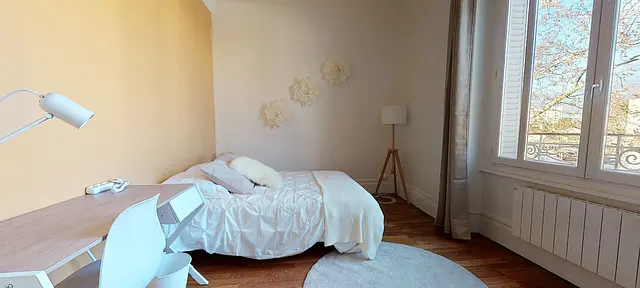La chambre 1 de plus de 12m2 est très lumineuse grâce à sa grande double fenêtre et à son mur jaune pastel. Elle se compose d’un lit double, d’un bureau, d’une chaise et d’un placard avec plusieurs étagères.