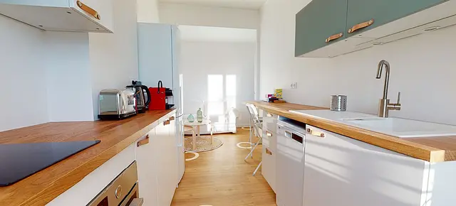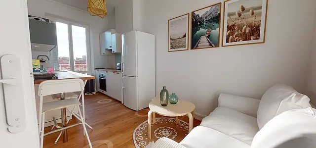 L’appartement se compose d’une pièce de vie composé de 2 espaces : un espace cuisine et un espace salon. L’espace cuisine est totalement aménagée et équipée : four, frigo, lave-vaisselle, machine à café, plaques de cuisson et de nombreux rangements. L’espace salon est composée d’un bar avec tabouret, un canapé et une table basse.