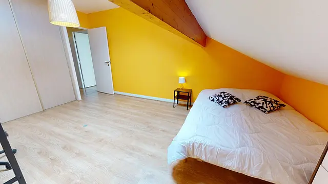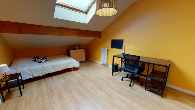 La chambre 5, la dernière de cette colocation, mesure 12m2 et est tout comme les autres chambres située à l’étage mansardée. Cette chambre est aménagée : d’un lit double, d’un bureau, d’une chaise et d’un grand placard intégré.