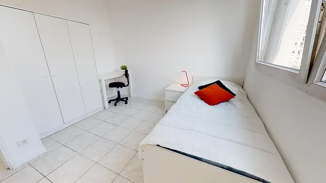 La chambre 1 située au fond du couloir est équipée avec un lit simple, un bureau, une chaise et des rangements.