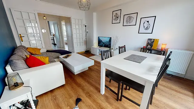 Cette colocation comporte un grand salon lumineux avec une table à manger, un canapé d’angle, une table basse et une TV.