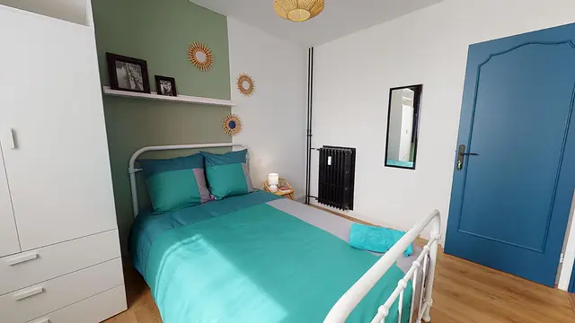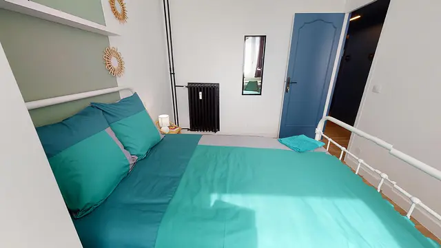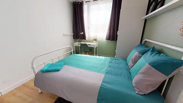 La chambre 3 ou la chambre verte mesure 10m2. Cette chambre est aménagée avec un lit double, un bureau, une chaise et des rangements.