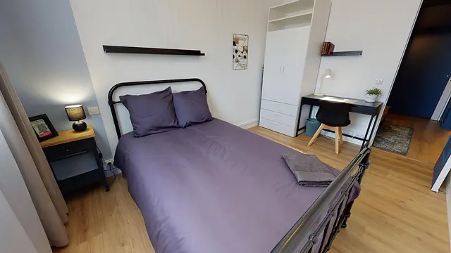 La chambre 5 de 10,5m2 est adjacente au salon. Cette chambre confortable comprend : un lit double, un bureau, une chaise et des rangements.