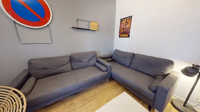 L’appartement dispose d’une cuisine spacieuse et conviviale, équipée de nombreux rangements, d’un lave-vaisselle, d’un four, d’un micro-ondes, d’un grand réfrigérateur et d’une table à manger. Un salon séparé et aménagé avec canapés et télévision offre un espace idéal pour se détendre et partager des moments entre colocataires.